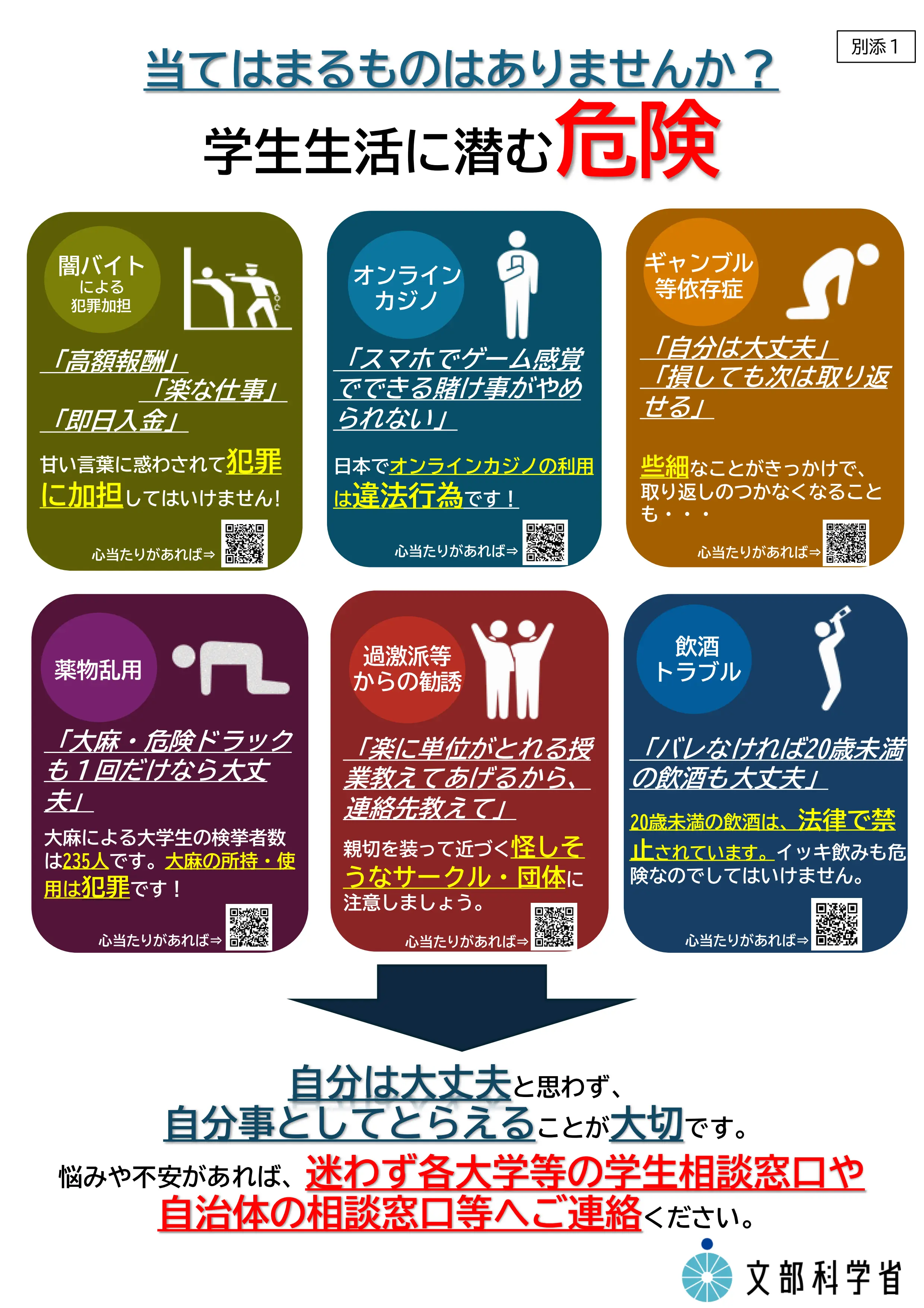 学生生活に潜む危険を知り、「自分は大丈夫」と思わず、自分事としてとらえることが大切です。悩みや不安なことがあれば、迷わず各大学等の学生相談窓口や自治体の相談窓口等へご連絡ください。