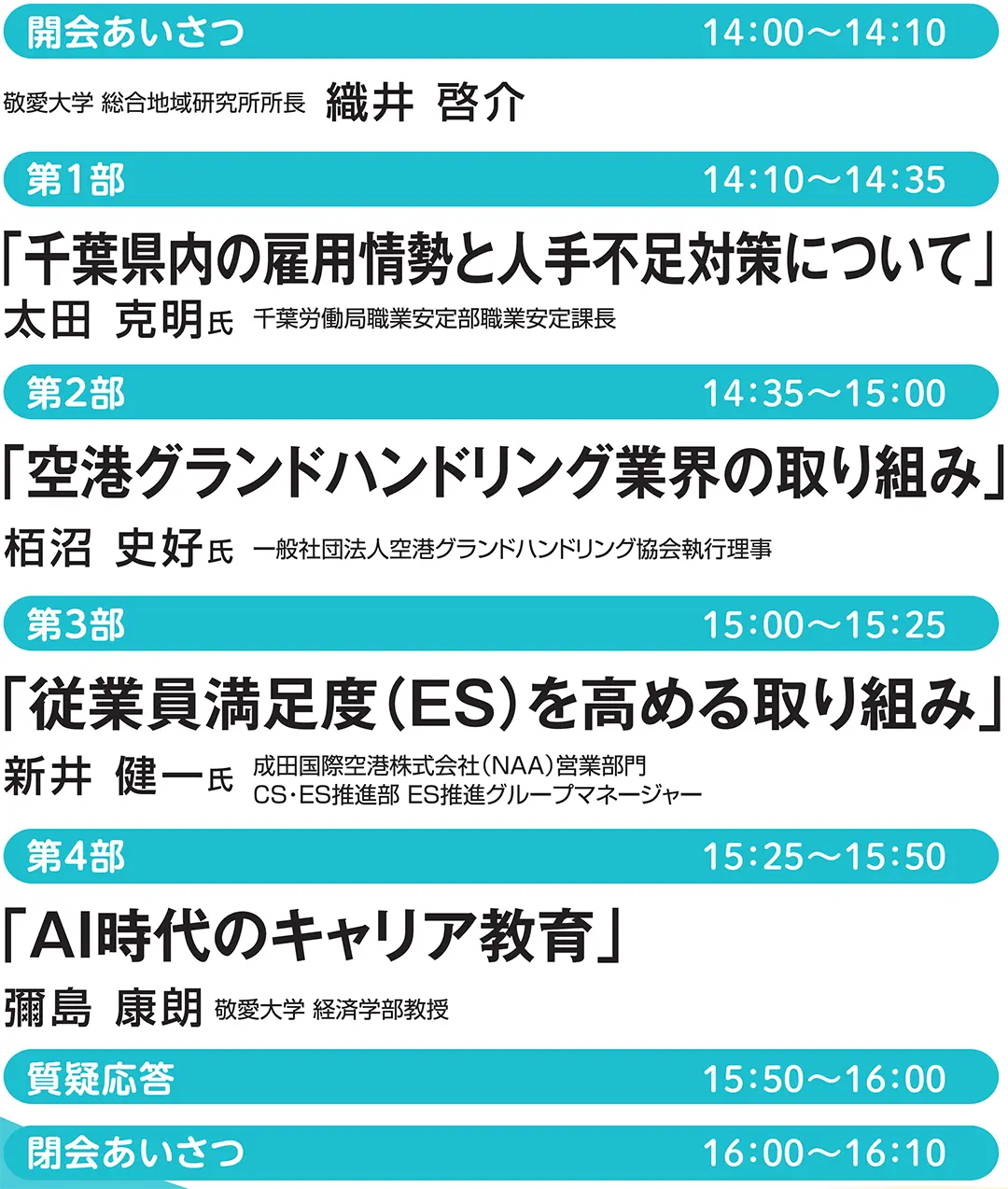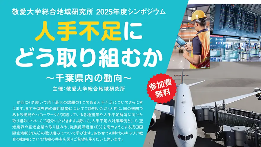 1/31(土)、総合地域研究所シンポジウム「人手不足にどう取り組むか ~千葉県内の動向~」 概要 開催日時 2026年1月31日(土) 14:00~16:10 受付開始 13:30 場所 敬愛大学 1号館6階 申込方法 下記URLよりお申し込みください。 https://forms.gle/xAACmi4ZXYi2SHRU9 ※申込期限:2025年1月26日(月) プログラム