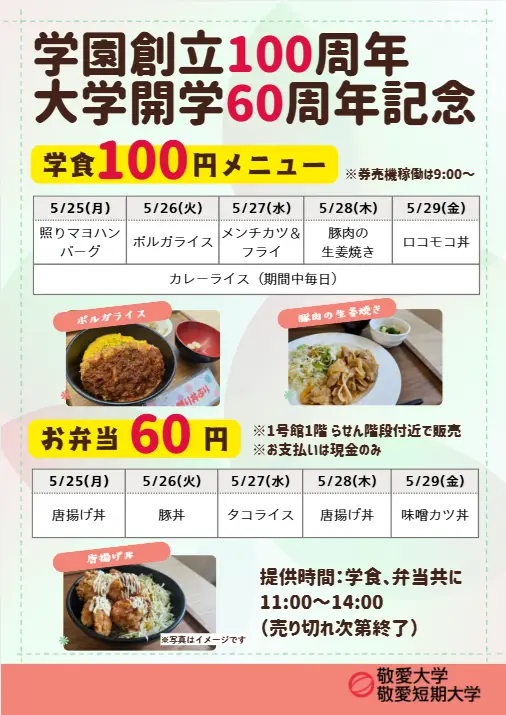 学園創立100周年×大学開学60周年を“食”でお祝いします。記念企画として、学食はなんと100円、お弁当は60円で提供します。特別なチャンスをぜひ楽しんでください!