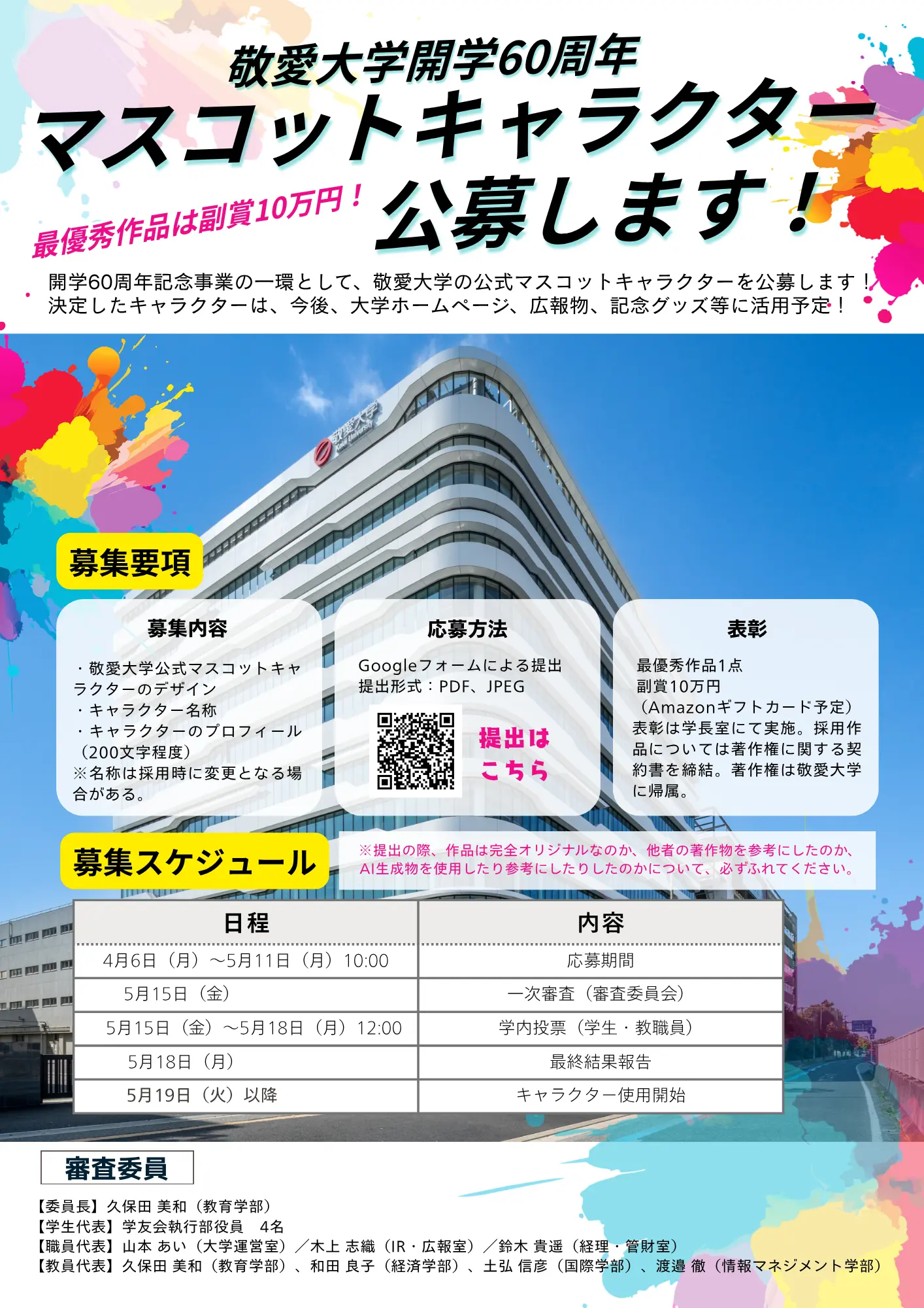 敬愛大学のマスコットキャラクターを公募します!決定したキャラクターは今後、大学ホームページや広報物、記念グッズ等に活用予定です。最優秀作品には副賞として10万円を進呈します。