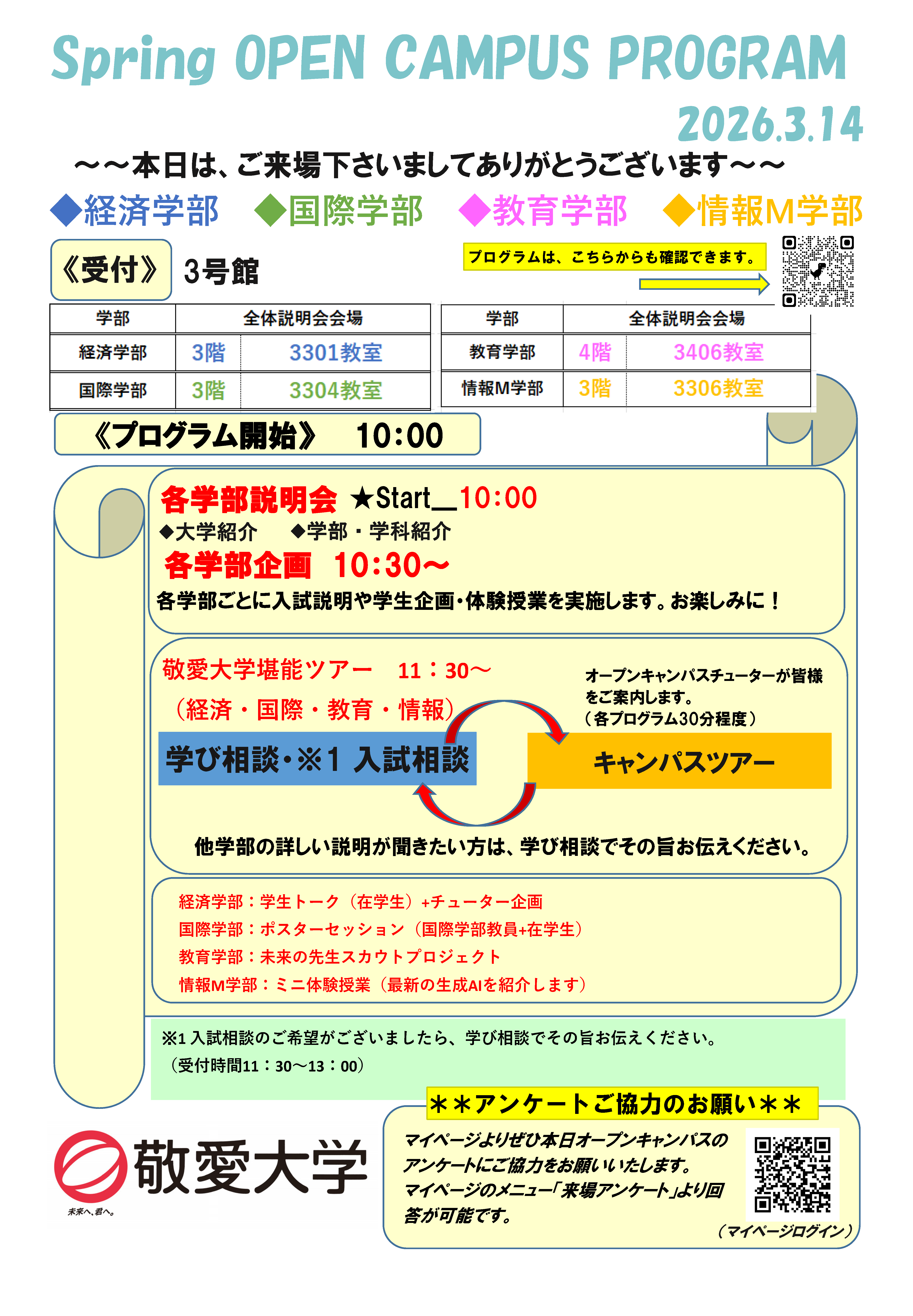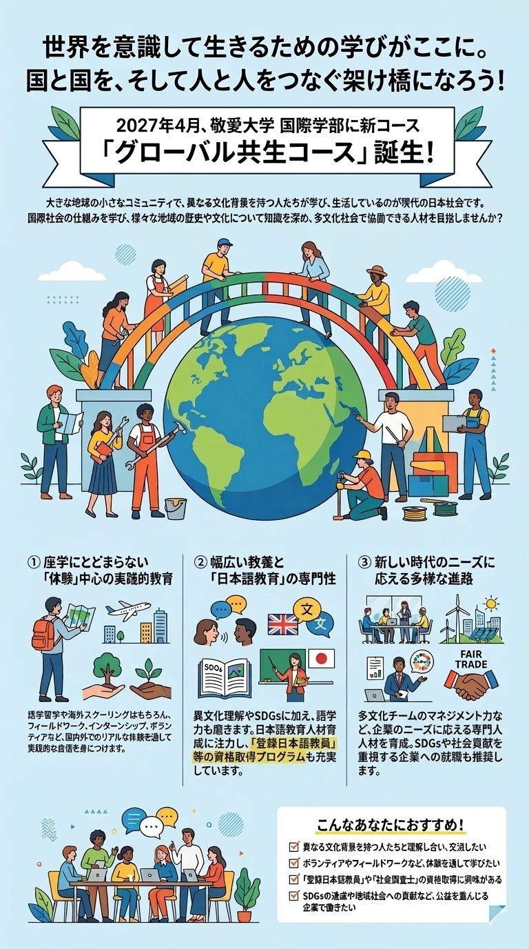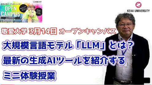 | 【PICKUPプログラム】学生企画 学生スタッフによる学生企画を実施します。実際に敬愛大学の授業を受けた学生たちが、敬愛大学の授業の中で印象に残っていることや授業内での活動などを発表する予定です。リアルな敬愛大学の学生の様子を見ることができますのでお楽しみに。 |