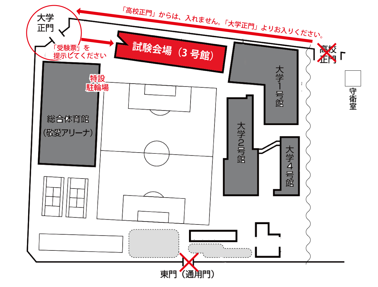 ※「高校正門」からは入構できません。必ず大学正門より入場してください。