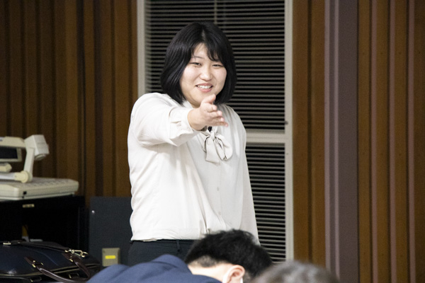 その後、3名の卒業生による着任までの準備や着任時の注意、4月からの生活、授業準備、学校行事などについての報告がありました。昨年の4月に教職生活をスタートしたばかりの先輩達の体験談は、どれもリアリティのあるものでした。時には学生を大いに笑わせながら自身に注目させるその姿は、学生の参考になりました。