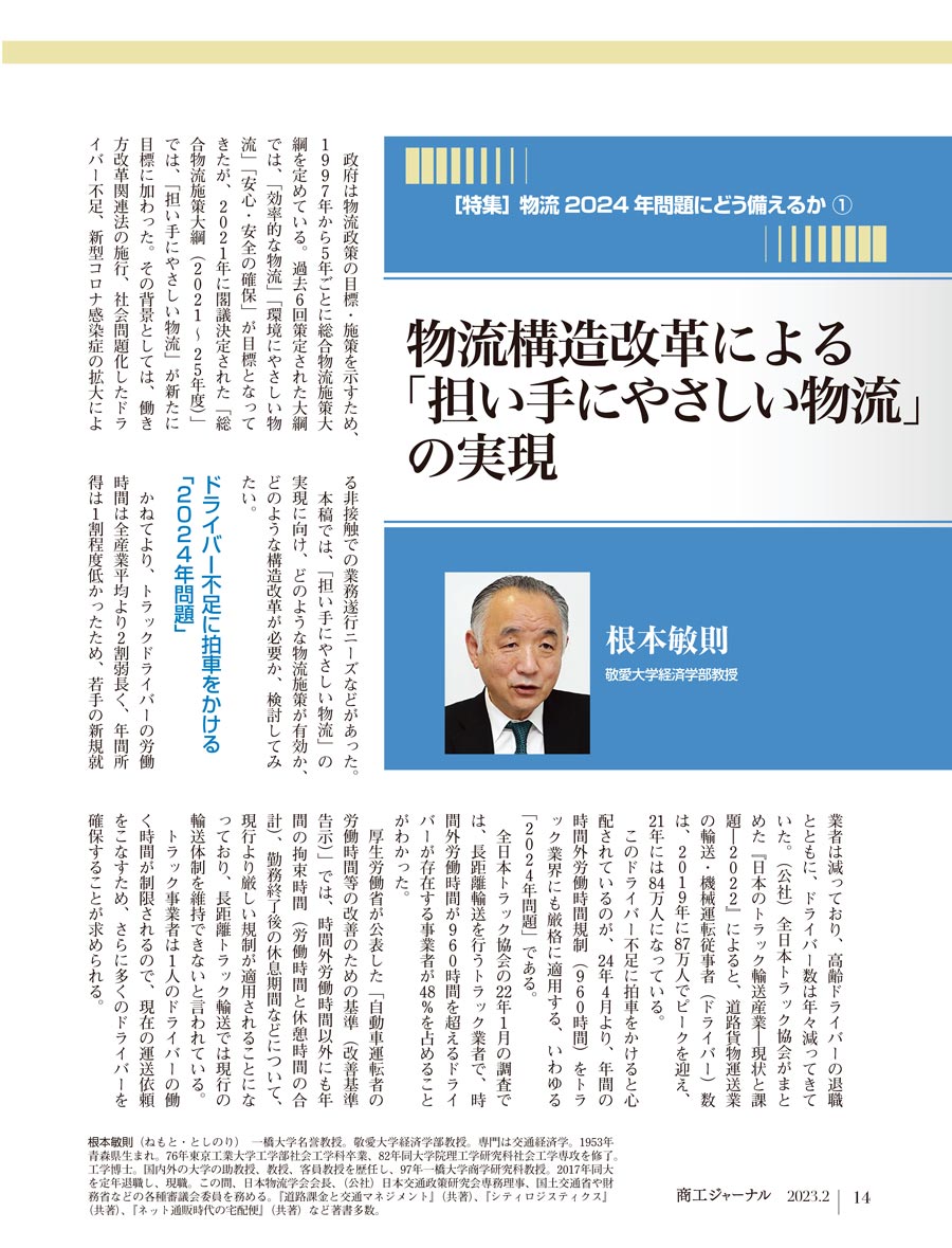 2021年に閣議決定された「総合物流施策大綱」では、新たに「担い手にやさしい物流」が目標に加わりました。年間の時間外労働規制がトラック業界にも厳格に適用されるようになり、トラックドライバーの担い手不足が懸念されています(「2024年問題」)。これについて経済学部の根本教授が『商工ジャーナル』2023年2月号の特集記事において、日本のトラック輸送業界の問題点とその解決策をまとめています。