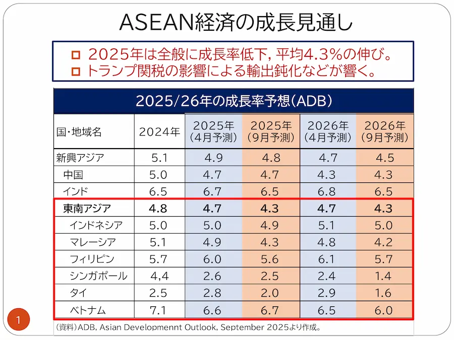 日本企業の重要な事業展開先である東南アジア諸国連合(ASEAN)は米国と貿易・投資面で深い関係にありますが、トランプ大統領から高率関税を突き付けられ、経済の先行きに不透明感が漂っています。牛山教授は講演で、ASEANの経済成長率は今年と来年、伸び悩むとの見通しを示すとともに、トランプ関税に関連するASEAN経済の注目点として、