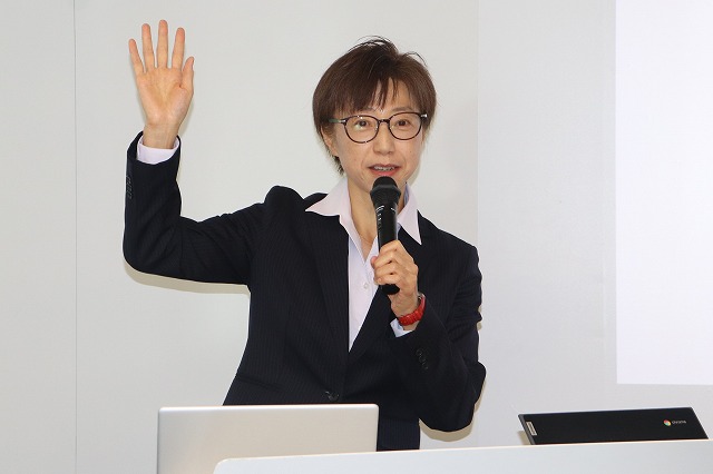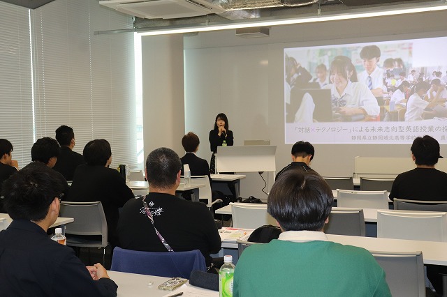 講師の石川真由美先生(静岡県立静岡城北高等学校 教諭)は、グローバル化が加速するにつれて、生徒が日本にいながら英語を使って世界とつながり、自他を尊重しながら対話ができる人間に育つように求められている今、「個別最適な学び」と「協働的な学び」をいかに両立させるかが重要な課題だとお話しになりました。その上で、生徒一人ひとりの学びをICTや生成AIの活用を通じて支援しながら、教室での対面による対話や協働活動も充実させる方法を検討され、その実践をご紹介いただきました。先生が授業で使用しているAI採点システムを実際に体験させていただくなど、これまでにないセミナーになりました。他方、AIやICTの使用が教員の負担軽減になるのか、模試などの成績向上につながるのかといった疑問にも対応した内容に、多くの受講者が驚かされたようです。特に本学学生(中高英語課程履修者)には大きな刺激になったようです。