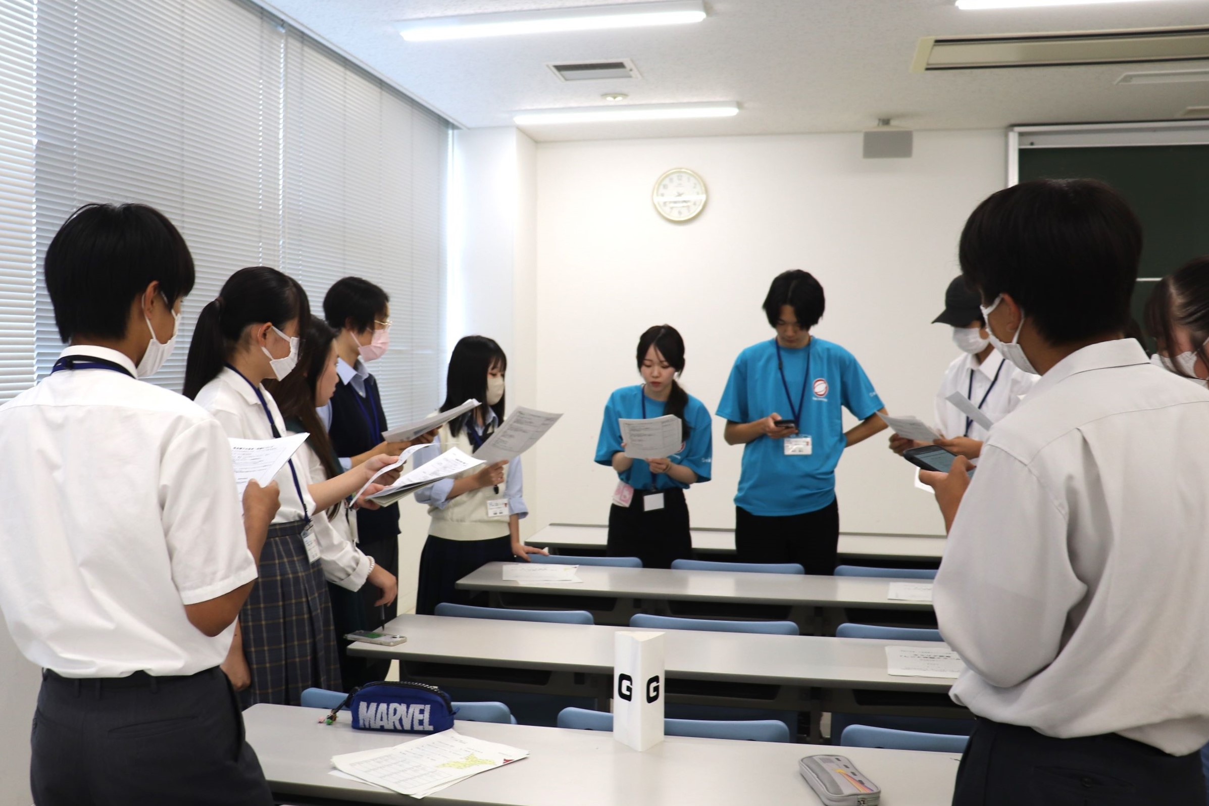 4日間のプログラム初日は本学で行われ、飛鳥井郁枝先生のご指導の下、「職業としごとの違い」や「働くことの意味」、「取材のしかた」を学びました。本学1~3年生の学生スタッフ9名も研修の進行補助を担当しました。 県内全域から集まった中学生・高校生60名も、学生スタッフのサポートを受けながら少しずつグループ毎の輪に溶け込み、翌日からの企業での就業体験に期待しながら帰宅しました。学生スタッフも事前に就業体験先と打ち合わせを重ねており、その情報を丁寧に伝え、激励していました。