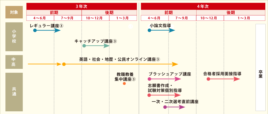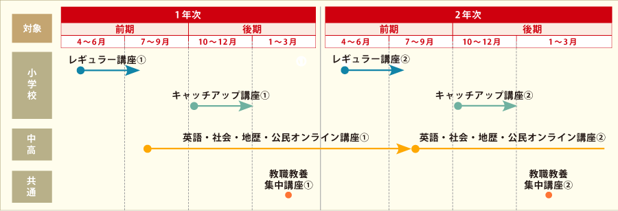 採用選考の教職教養筆記試験の出題傾向にそって基礎を身につけ、知識の充実を図ります。